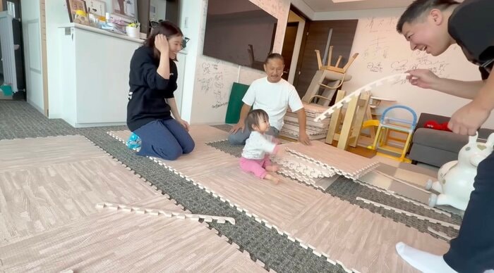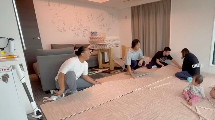 ところどころ盛り上がり、でこぼこし始めたリビングの床マット。そのままでは歩けるようになったにこりちゃんが危ない…ということで、夫・山本さんの友人たちに協力してもらいながらしっかりとした綺麗なマットに取り替える作業をしていきます。