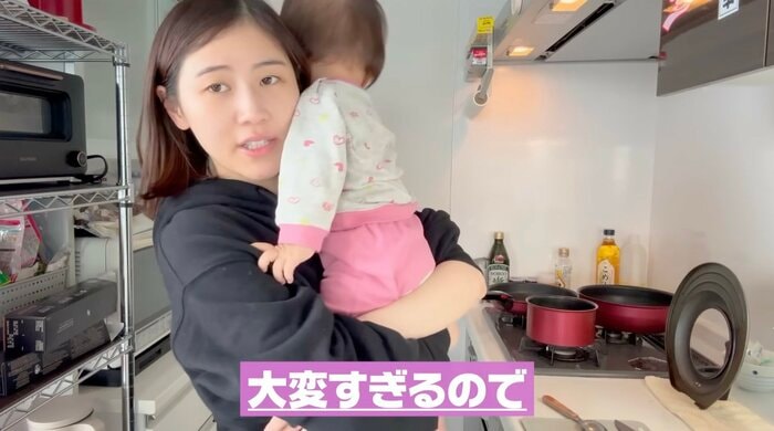 結局キッチンで、にこりちゃんを抱っこする西野さん。やっとのことで朝ごはんを作り終わった頃には、床の大改造の前にぐったりです…。