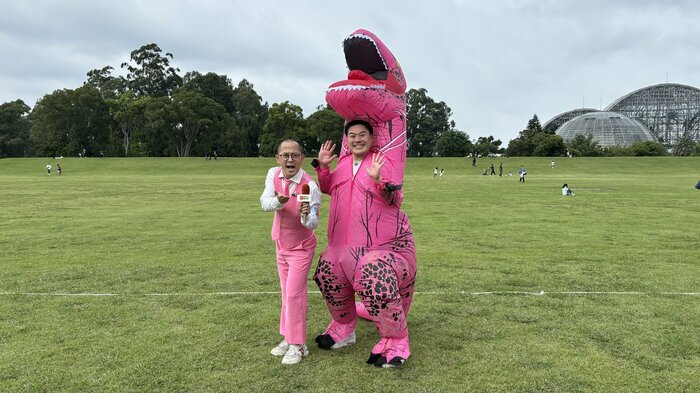 参加者全員が色とりどりの恐竜の着ぐるみを着て広場に集まり競い合う「ティラノサウルスレース」に潜入します。