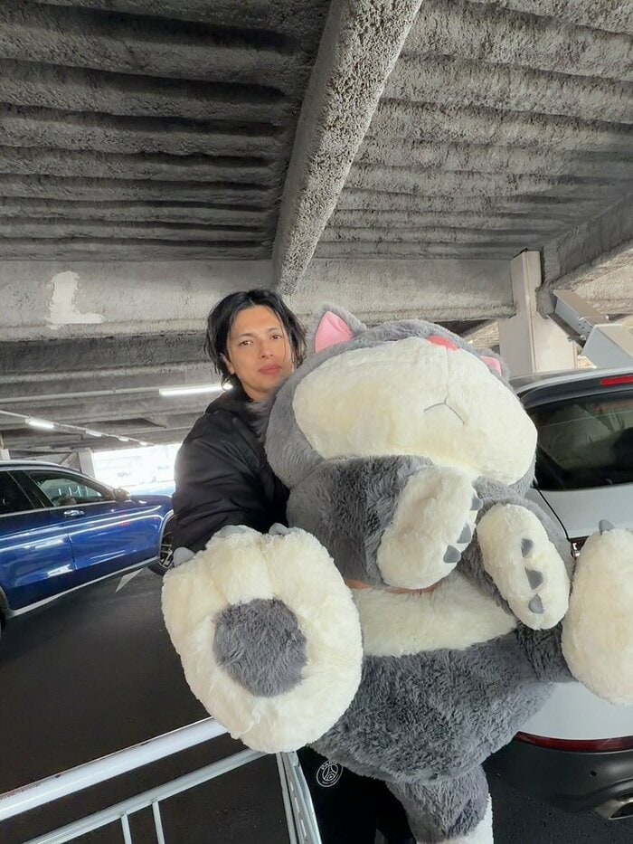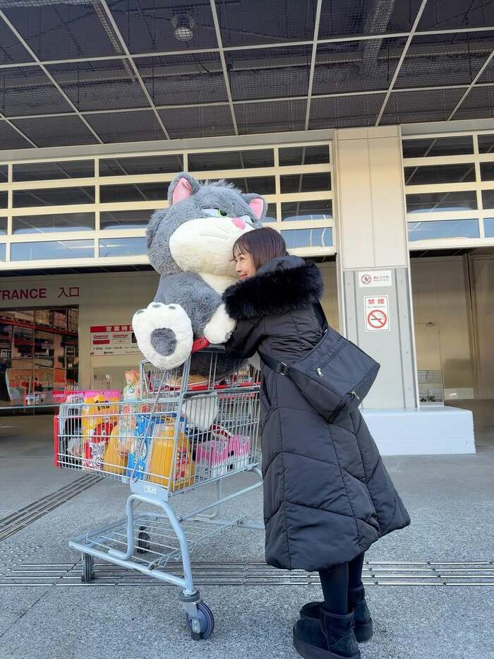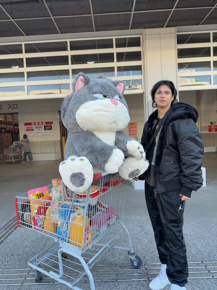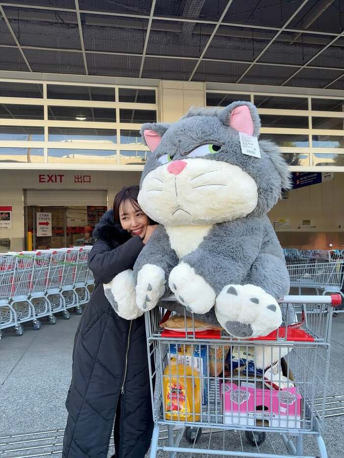 そこには、シンデレラに登場する猫・ルシファーの巨大ぬいぐるみを抱えたアレクさんの姿が!コストコで購入したそうで、その大きさは、およそ80cm!