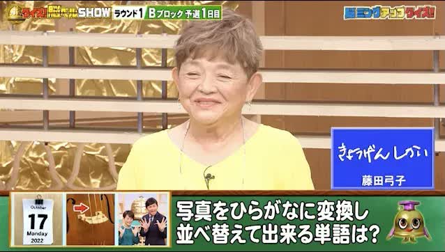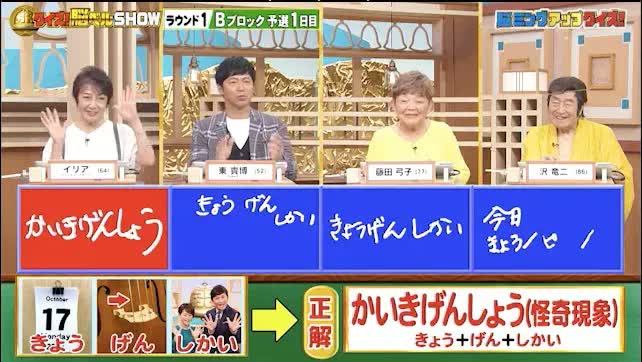 今回の解答者は、歌手・イリアさん(64)、お笑いタレント・東貴博さん(52)、女優・藤田弓子さん(77)、俳優・沢竜二さん(86)の4名です。
