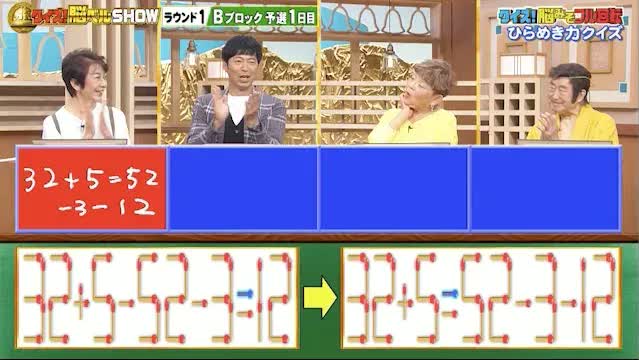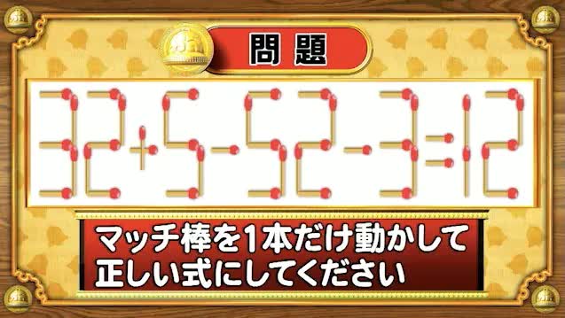 正解はまず、「=」から1本取って「-」にします。その1本を今度は「-」に足して「=」にします。そうすれば「32+5=52-3-12」となります。イリアさん1人だけ見事正解!