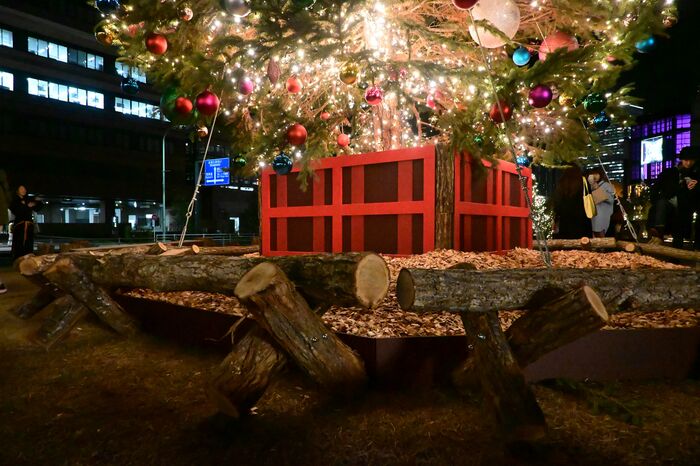 そのツリーの土台を見てみると、木で組まれた柵で囲まれており、ウッドチップが敷き詰められています。