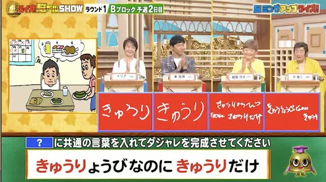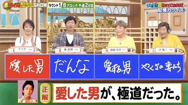 今回の解答者は、歌手・イリアさん(64)、お笑いタレント・東貴博さん(52)、女優・藤田弓子さん(77)、俳優・沢竜二さん(86)の4名です。