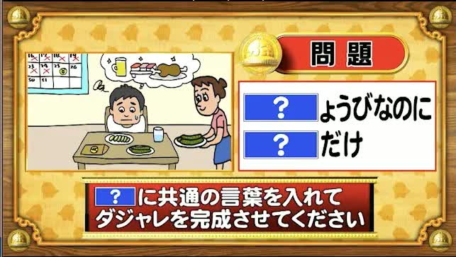 最初は「脳ミングアップクイズ」から、ダジャレ穴埋めの問題。「?」に共通する言葉を入れてダジャレを完成させてください。