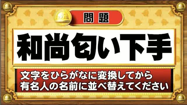 次は、シャッフル人名の問題。次の文字をひらがなに変換してから、ある有名人の名前に並べ替えてください。