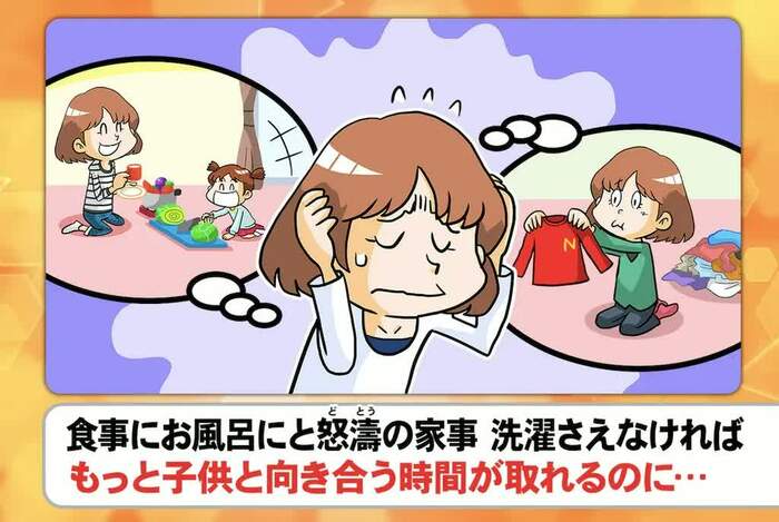 「仕事から帰って寝かしつけまでの4時間、座る暇すらない。洗濯物を干して、翌日の保育園の準備のために乾いた洗濯物を畳んだりする手間を減らすことができれば、もっと子供と遊ぶ時間を作れるのに」という、女性のお悩みも登場しました。
