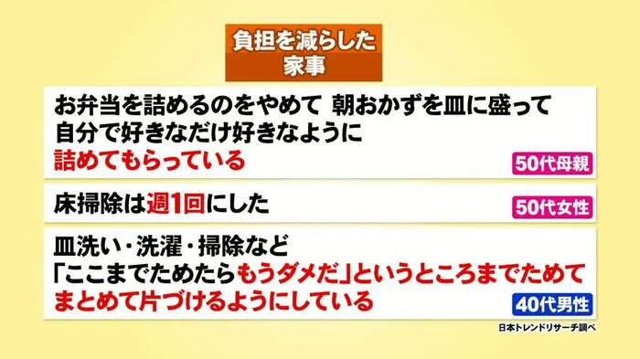 まず紹介されたのは、アンケートで寄せられた「負担を減らした家事」の実例です。