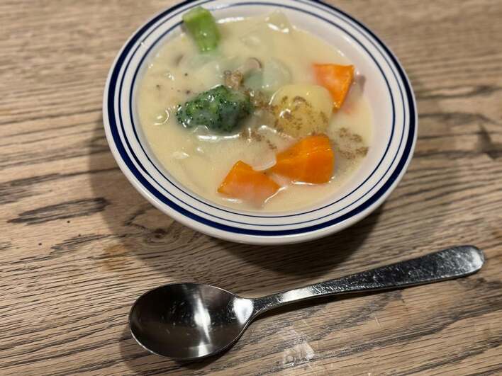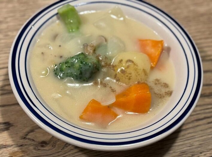 縁がネイビー色デザインのお皿に盛り付けられていて、にんじんやブロッコリー、じゃがいも、玉ねぎなど大きめにカットされた野菜がふんだんに入れられています。