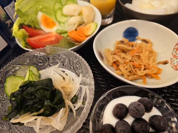 高橋さんは「キュウリとワカメの酢の物も旨い!」と明かしていて、透明なお皿に入れられた酢の物をパシャリ!一番大きなお皿には、トマトやゆで卵がトッピングされたサラダもあります。