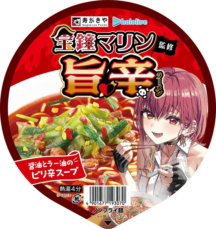 今回登場するのは、「宝鐘マリン監修 シーフード豚骨ラーメン」と「宝鐘マリン監修 旨辛ラーメン」の2種類。このコラボは、宝鐘マリンさんが常々“寿がきや愛”を語っていたことから実現した夢の企画なんです!