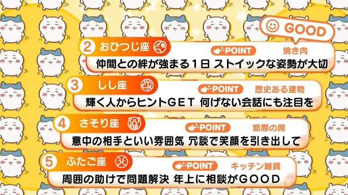 『めざましテレビ』で放送中の「ちいかわ占い」 テレビ放送がない日はお休みで、月~土:朝7時以降に更新予定です。