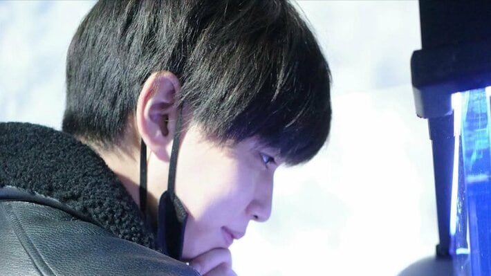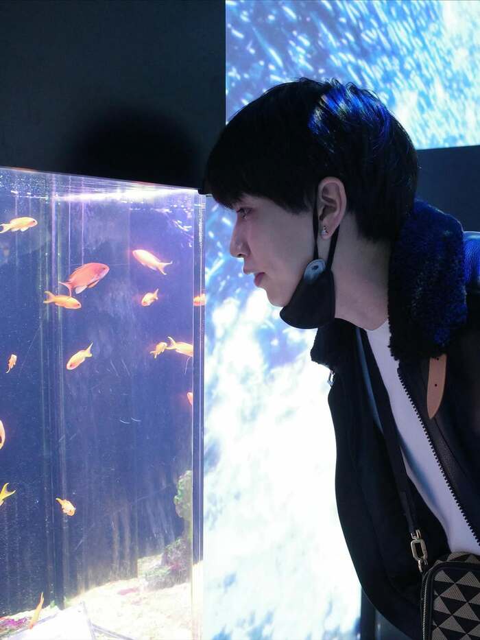 小さな水槽の前では熱帯魚が泳ぎ、それをじっと眺めるはじめしゃちょーさんの横顔ショットも。