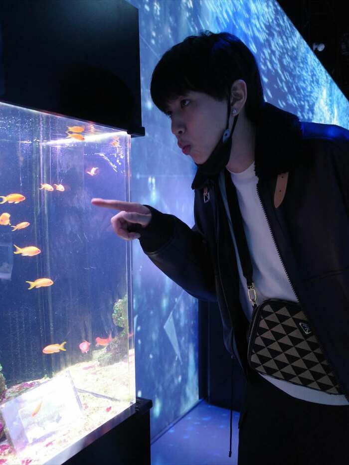 投稿した写真には、大きな水槽の前に立ち優雅に泳ぐ魚たちを眺めるはじめしゃちょーさん。頭上にはキラキラと光る水面が写り、神秘的な雰囲気に包まれています。