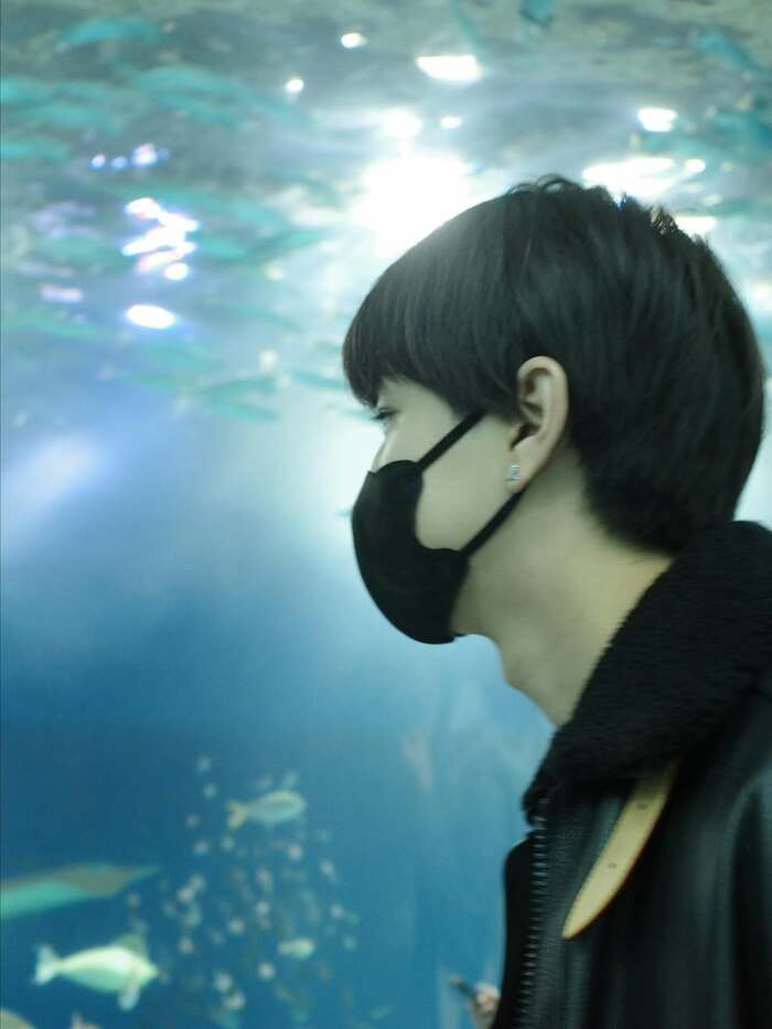 また、青い光に包まれクラゲがぷかぷか浮かぶ水槽が並んだエリアでは、妻との2ショットも披露!鏡に映った自分たちを妻が持つスマホで自撮りする様子が写し出されています。