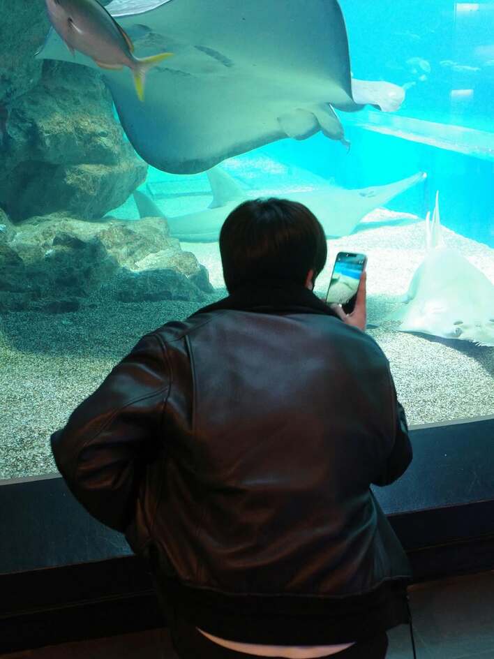 そんな妻が撮影する写真には、水槽の中のエイをスマホで撮影しているはじめしゃちょーさんの後ろ姿や…。