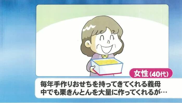「義母が手作りの栗きんとんを持ってきてくれるのだが、自分も子どもも食べないので困る」という40代女性のお悩みに関しては、「義母の持ってきたものを断るなんて無理!」という坂下と、「毎年のことだから、早めに断りたい」という千秋と小倉の間で意見が割れた。