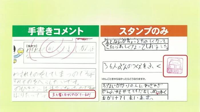 また、採点に関して「授業中に終わらせるために正解に丸はつけず、不正解だけチェックする」というさる先生の流儀が紹介されると、坂下や小倉は「親としては花丸や手書きのコメントがほしい!」と残念そうな表情に。竹山は「欧米では丸は付けないのだから、グローバル化のためにも丸付けは省略してもよい」とさる先生をフォローした。