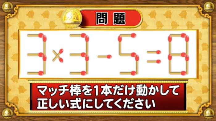 最初は、マッチ棒問題。次の式のマッチ棒を1本だけ動かして正しい式にしてください。
