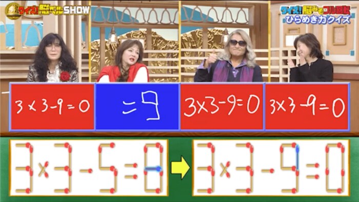 正解はまず、「8」から1本を動かし「0」にします。その1本を「5」に足して「9」にします。そうすれば「3×3-9=0」となります。純さん、はたけさん、岡さんが正解。