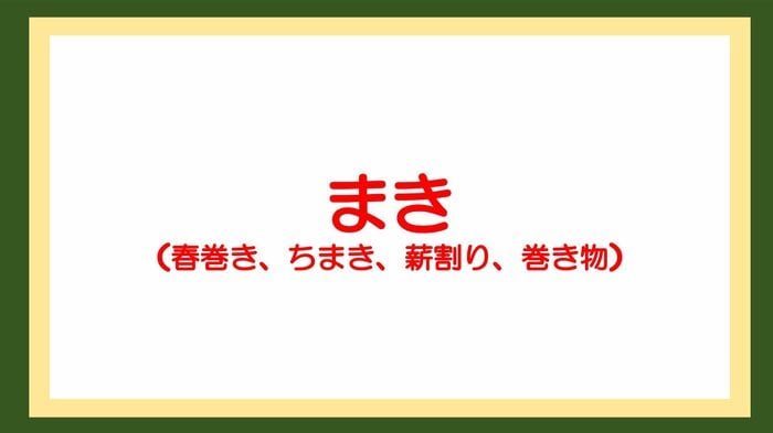 正解は「はる(春巻き・ちまき・巻き割り・巻物)」。
