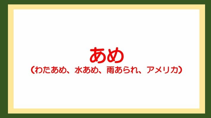 「わた[?]」「みず[?]」「[?]あられ」「[?]りか」。4つのイラストに共通してくっつくワードは何でしょうか?