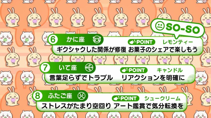 『めざましテレビ』で放送中の「ちいかわ占い」 テレビ放送がない日はお休みで、月~土:朝7時以降に更新予定です。
