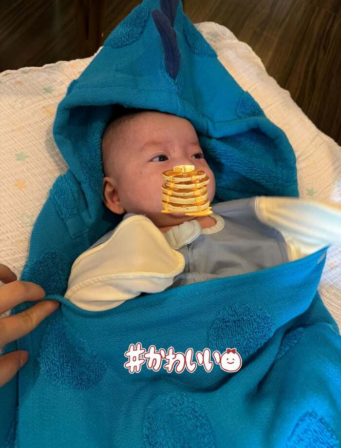 まず紹介したのは、親戚にもらったという恐竜のデザインをしたおくるみ。頭を覆うフードの部分に恐竜らしいギザギザがあり、タオル生地でとっても気持ちよさそうです。