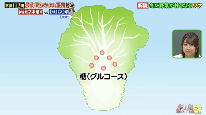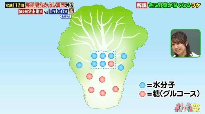 なぜ冬に分解が進むかというと、野菜の中の水が凍ってしまうのを防いでいるから。デンプンという大きな固まりを分解して小さな糖を増やすことで、水分子が凍りにくくなるのだといいます。