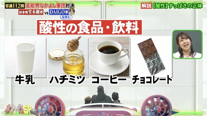 「炭酸」も「酸性」ですが、酸っぱさを感じないのは水素イオンの濃度が低いため。ほかにも、「牛乳」「ハチミツ」「コーヒー」「チョコレート」も「酸性」の食べ物なのだそうです。