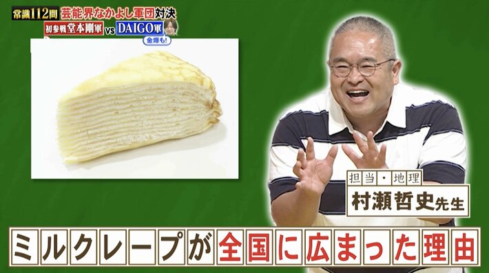 食べ物の写真を見て名前を答える問題では、出題されたミルクレープについて地理担当の村瀬哲史先生が解説を加えました。