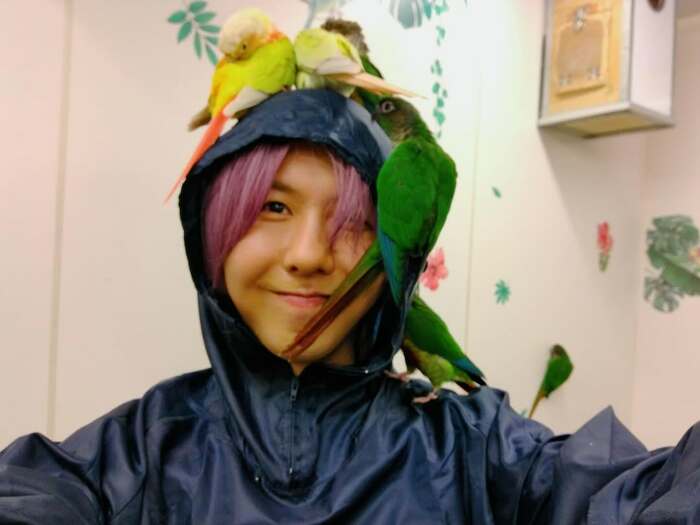 ピンク×グレーの色をした鳥が藤澤さんの頭と肩の上にそれぞれちょこんと乗っかっています。さらに、黄緑のような色味の鳥も反対側の肩に。