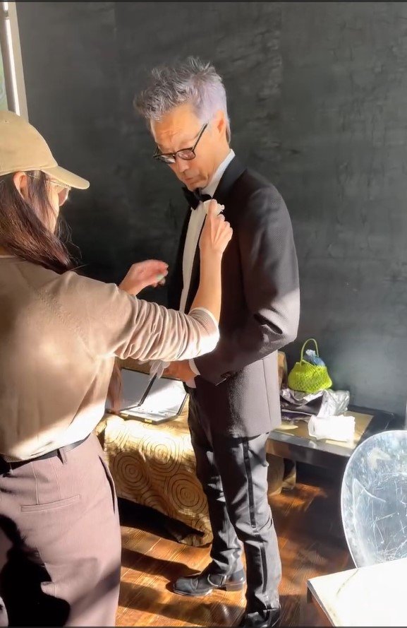 また、黒のタキシードに身を包んだ世継さんは、身だしなみをスタッフに整えてもらい、準備完了。いよいよ撮影開始です。