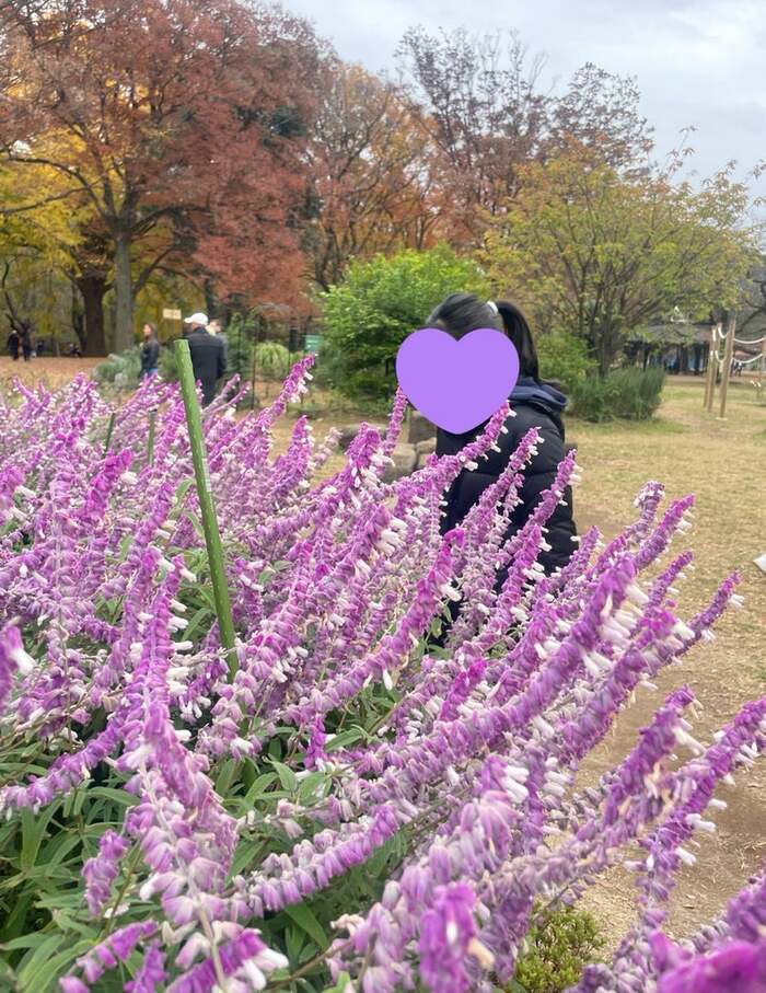 近くで咲き誇る美しい紫色に染まったアメジストセージのような花を見つめている姿も!ふわふわした花がとってもかわいらしいですね♪
