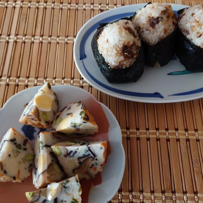 お皿には、のりが巻かれた三角おにぎりが3個。具材が混ぜ込まれたご飯には、ごまもまぶされておりとってもおいしそう!