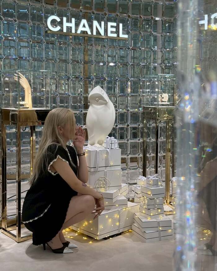 そして、白いギフトボックスが何段も積み重なったホリデームード漂うディスプレイの前で、背筋を伸ばしてしゃがんでいる様子も披露。ぴったりと揃えられた美しい脚が目を引きますね。