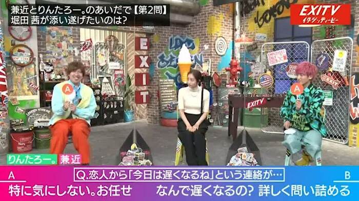 「恋人から『今日は遅くなるね』という連絡が…」という質問に、「特に気にしない。お任せ」を選んだ兼近さんが「(女性は)詮索されるの嫌だって読んだことがある。あとインスタでよく『これをされたら女子は嫌がる』っていうのが出てくる」と説明すると、堀田さんから「中学生みたい」と失笑される場面も。