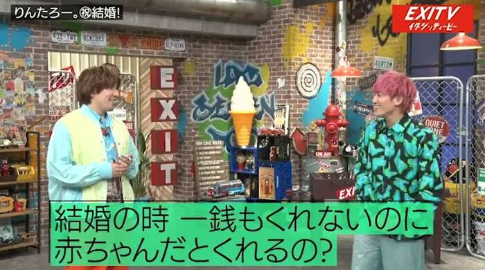 オープニングトークでは、りんたろー。さんが今年8月にグラビアアイドルの本郷杏奈さんとの結婚をファンクラブのブログで発表したことについて、りんたろー。さんは、「ここ(『EXITV』)で言いたかったよね。次になんか発表するときは、ここにしよう。ベイビーとかね」と振り返ります。
