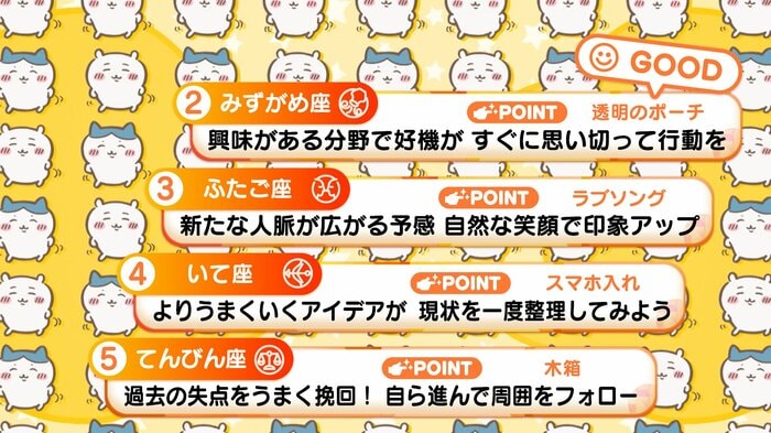 『めざましテレビ』で放送中の「ちいかわ占い」 テレビ放送がない日はお休みで、月~土:朝7時以降に更新予定です。