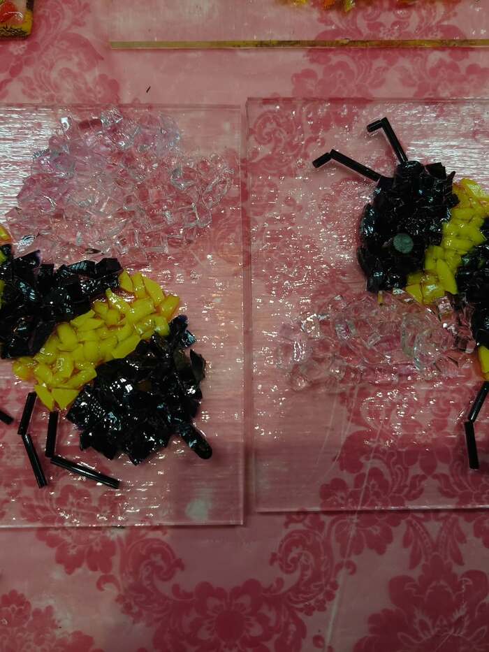 公開された写真を見ると、透明のガラスの上に、かわいらしいミツバチが表現されています。細かなパーツを丁寧に並べて作っているようです。