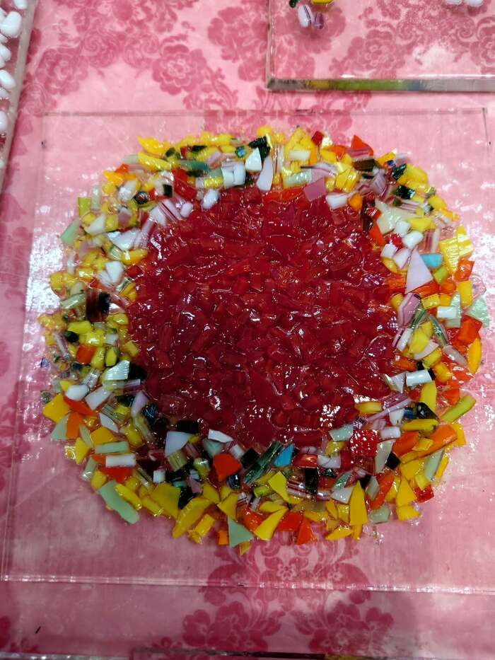 また、赤いガラスを中心に、色とりどりのガラスが囲んでいる、秋野さんの感性があふれた作品も。