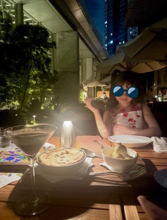 公開された写真には、デザートを食べる長女の後ろからぎゅっと体を寄せる紅蘭さんの姿が。