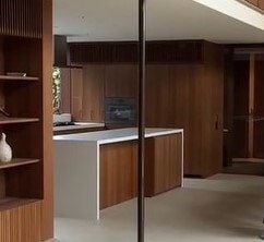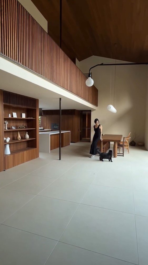 リビングは天井がとても高く吹き抜けのような作りになっていて、開放感にあふれています。優しい色合いをした白い壁と、落ち着いた雰囲気のウォールナット系の木材が、洗練されたラグジュアリー感とぬくもりが同居する空間を作り上げていて、とても素敵なお部屋になっています。