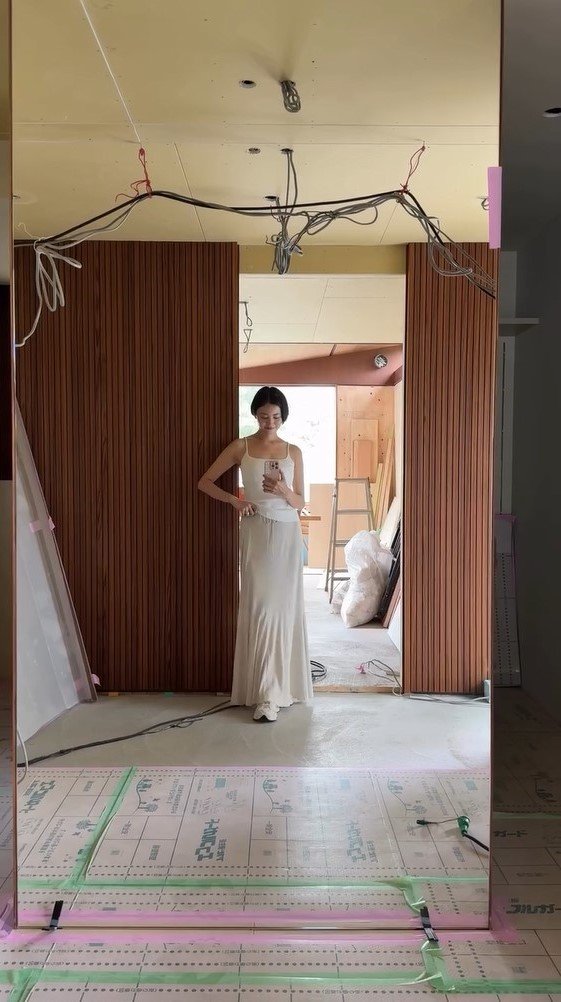 9月には、建築途中の家を訪れていて、「玄関に鏡と背面には木ルーバーが設置されました」と、大きな全身鏡の前での自撮りショットを披露。