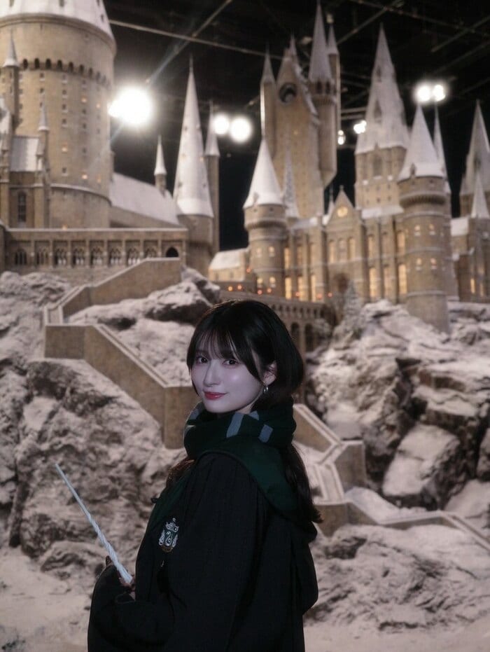 雪化粧が施されたホグワーツ城と相まって、ツヤ肌の吉川さんが光輝いて見えますね。