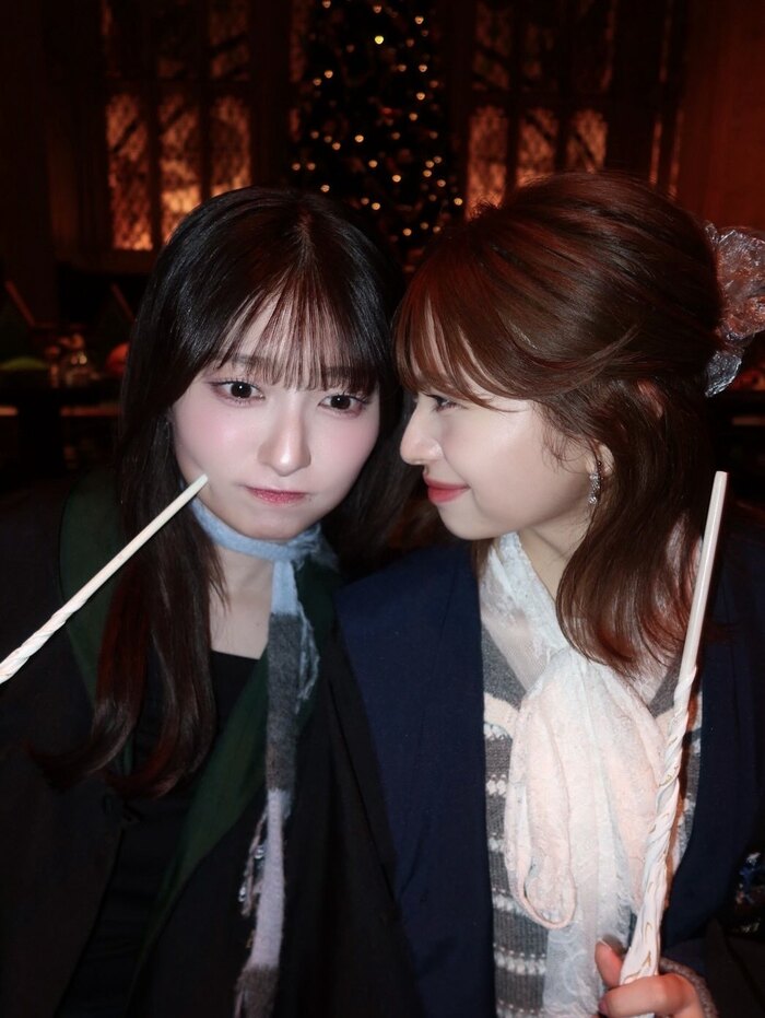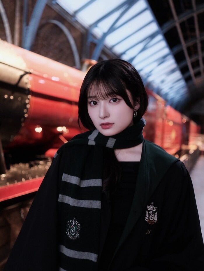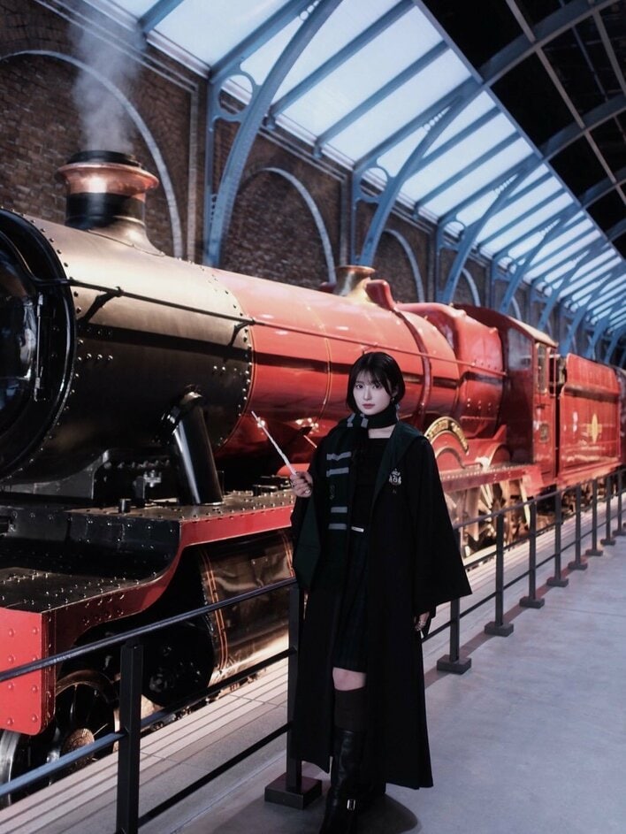 投稿された写真には、映画『ハリー・ポッター』に登場する学生寮のひとつ『スリザリン』のマントを着て、魔法界の入り口となるホグワーツ特急の前でポーズを決める吉川さんの姿が。片手には、しっかりと魔法の杖が握られています。