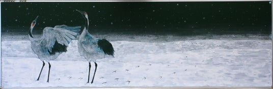 真っさらで何も無い雪景色に、鶴が二羽だけで歩いている場面を描きました。