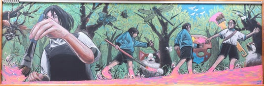 絵の具から生み出された私たち3人は、これから冒険へと出かけます。その森にはカブトムシやトンボ、猫に鴨など巨大生物たちが…。でも私たちは恐れません。3年間ともに過ごした日々と絆があるから。この先に立ちはだかる困難にも、大好きな絵の道具を武器に果敢に挑んでいきます。仲良し3人で中学校生活最後の夏、今の思いを絵で表現したいと、黒板アートに初挑戦しました。これから迎える卒業や人生を「冒険」と捉え、今回の作品のテーマとしました。私たちが暮らす生田地域は緑地もあり、自然が豊かなので冒険の舞台を森としました。鴨やカブトムシなどは実際に生田で出会った生物です。これからの人生のワクワクの象徴として描きました。また、中学校生活ではお互いに支え合いながら過ごすだけでなく、美術部では部長・副部長を務め、作品制作を通して切磋琢磨してきました。それぞれ進路先は違っても、3年間の思い出や大好きな美術を胸に人生を切り開いていきたいという思いで、自らの武器として筆やパレットを描くとともに、3人が前向きに歩んでいく姿を特に大切に描きました。