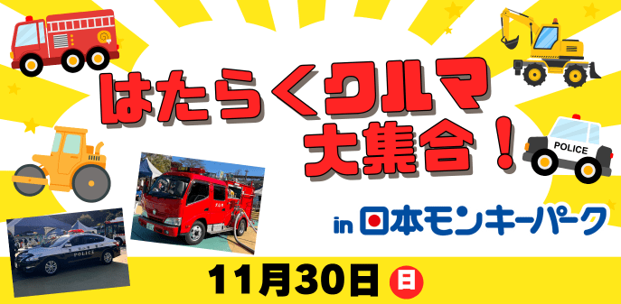 日本モンキーパーク(愛知県犬山市犬山官林26、所長:中井 祐輔)では、2025年11月30日(日)に子どもたちに人気の「はたらくクルマ」を一堂に集めたイベント「はたらくクルマ大集合!」を開催します。