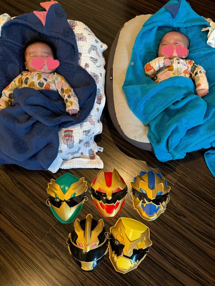 そして今回の投稿では、「酉の市にあったゴジュウジャーおめん!」とづづり、双子がすやすやと眠るそばに、戦隊ヒーローの「ゴジュウジャー」のおめんを並べたショットを披露。